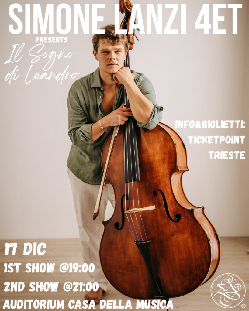 Simone Lanzi, classe ‘93, inizia a suonare il contrabbasso nel 2012, nel ‘13 entra nella classe del M° Giovanni Maier e dal ‘16 entra nella classe del M° Stefano Sciascia. Nel ’18 conclude il Bachelor di Contrabbasso Jazz con 104. Nel ‘21 inizia ad insegnare e nel ‘22 conclude il Bachelor di Contrabbasso Classico con 109.Ha collaborato con i progetti: Brazos – Black Suit Trio, Orchestra Laboratorio 3.0, Emanuele Grafitti Trio, Eastern Border Ensemble, TILT, Tsikarim e altri ancora.Ha registrato: Brazos-Black Suit Trio EP 1 e 2; Mingus’ Grooves; Edgar Meis; Eastern Border Ensemble; TILT; Misa A Buenos Aires-M. Palmeri; Emanuele Grafitti Trio.Avendo spaziato dalla musica greca e turca, al jazz e alla musica classica, negli ultimi due anni si è concentrato solo sul jazz in tutte le sue forme, cercando un proprio linguaggio improvvisativo, che trova il massimo della personalità nel suo ultimo progetto, Simone Lanzi 4et – Il Sogno di Leandro, album di musiche originali proprie registrato lo scorso dicembre a Trieste e pubblicato il 10 dicembre 2025.Workshop e Masterclasses a cui ha partecipato: Umbria Jazz, Veneto Jazz, Velenje Jazz, Zgrabi Zvok.Insegnanti di cui ha seguito le lezioni: Joe Sanders, Orlando Le Fleming, Stefano Senni, Giovanni Maier, Stefano Sciascia.