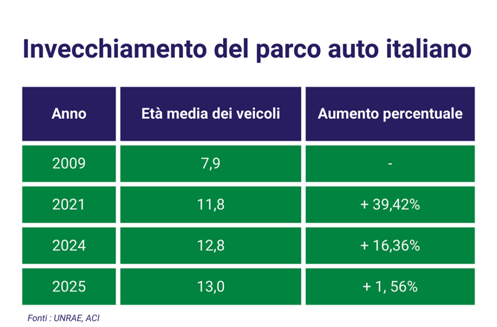 Secondo l’Annuario Statistico dell’Automobile Club d’Italia, a inizio 2025 l’età media delle autovetture italiane ha raggiunto 13 anni, proseguendo una tendenza ormai consolidata. Rispetto al 2009 — quando la media era di 7,9 anni secondo UNRAE — l’invecchiamento del parco è oggi superiore a 5 anni. Questo fenomeno è direttamente collegato alla contrazione del mercato del nuovo, con listini in costante aumento e una progressiva scomparsa delle versioni più economiche. Le auto moderne offrono più comfort e sicurezza grazie a una crescente presenza di componenti elettronici, ma ciò comporta anche interventi più costosi e una durata più breve di alcune parti.Un parco più vecchio implica quindi manutenzione più regolare: con l’aumento dei chilometri, guasti e interventi diventano più frequenti, mentre i costi non smettono di salire.