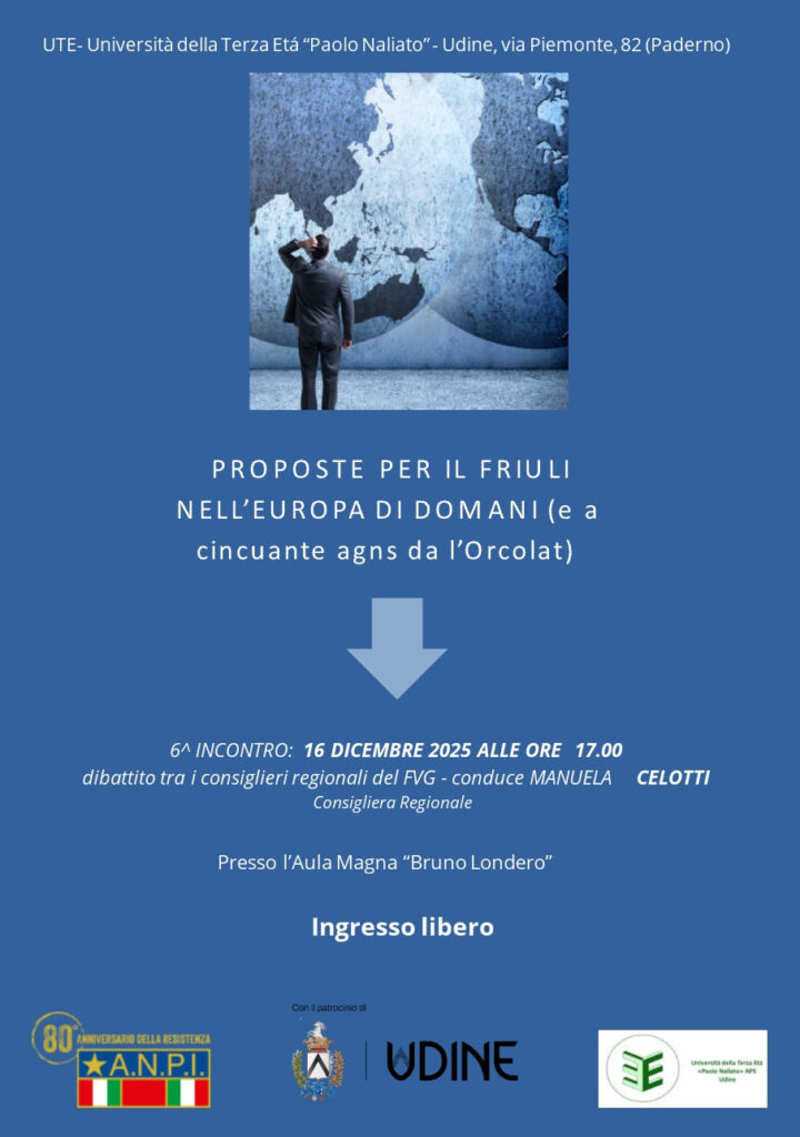 Il sesto e ultimo appuntamento, che si svolgerà martedì 16 dicembre, vedrà i consiglieri regionali del Friuli Venezia Giulia confrontarsi sul tema “Proposte per il Friuli nell’Europa di domani (e a cincuante agns da l’Orcolat). Il dibattito sarà moderato da Manuela Celotti.