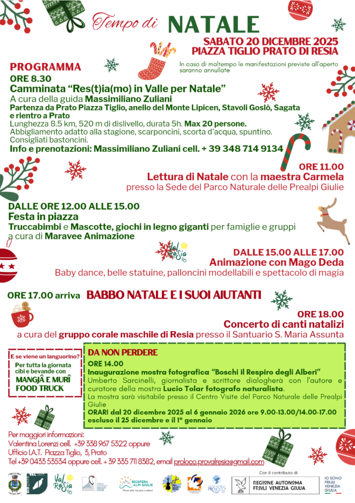 Sabato 20 dicembre 2025 la Val Resia ospiterà una giornata all’insegna del divertimento. Tempo di Natale è il titolo della manifestazione natalizia che si svolgerà a Prato in Piazza Tiglio e che unirà cultura e divertimento adatto a grandi e piccoli.