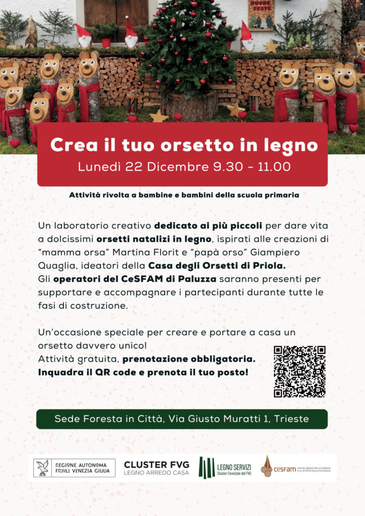 In occasione delle festività natalizie, lunedì 22 dicembre dalle 9.30 alle 11 presso la sede Foresta in Città a Trieste, in via Giusto Muratti 1, si terrà un laboratorio “Crea il tuo orsetto in legno”, dedicato ai bambini della scuola primaria.