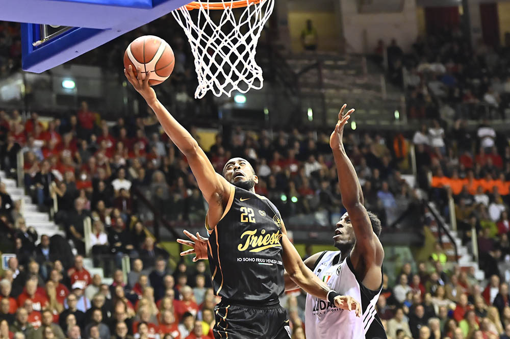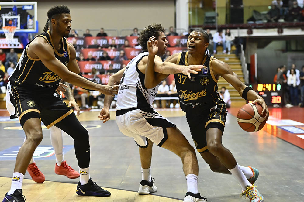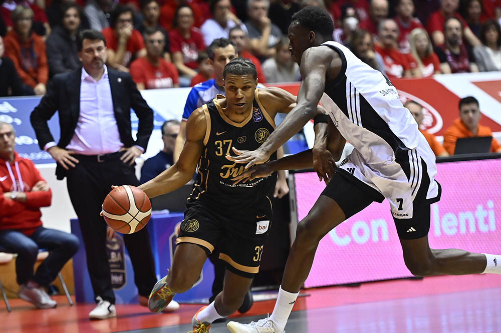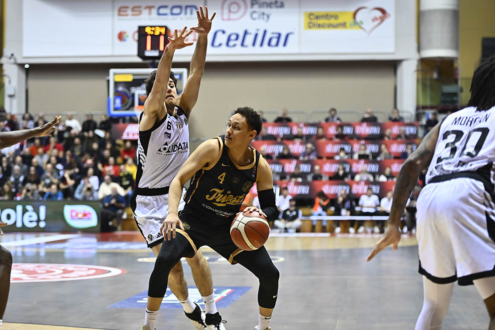 Secondo quarto. Trieste rientra con Ruzzier, Deangeli, Ramsey, Brooks e Toscano-Anderson. Morgan apre subito con la tripla dall’angolo, ma Toscano-Anderson risponde dall’angolo opposto dopo una finta. Diouf trova due punti nonostante la buona difesa di Trieste, poi Morgan serve Akele tutto solo sotto canestro.