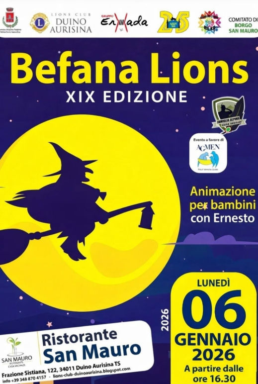6 gennaio 2026 a BORGO SAN MAURO dalle 16.00 dalle ore 16.30 – Presso il Ristorante San Mauro a Borgo San Mauro la tradizionale e tanto attesa Befana Lions (19 edizione) con animazione per i bambini ed adulti con l’arrivo della Vecchietta con dolci sorprese (fino alle ore 19.30) promosso dal Ristorante San Mauro e Lions Club Duino Aurisina e la collaborazione di Ajser 2000, il Gruppo Ermada Associazione Genitori Rilke Comitato di Borgo San Mauro Famiglia Alpina, Circolo Duinate, per la raccolta a favore dell’Agmen Fvg.Alle 17.00 presso lo Spazio Cultura di Borgo San Mauro inaugurazione della Mostra “Volti di donne” interpretazione artistica di Renato Sitar iniziativa promossa dal Gruppo Ermada Flavio Vidonis nell’ambito del progetto “Donne, Ženske, Woman, Femine: storie e voci di una terra di confine” con il sostegno della Regione FVG.