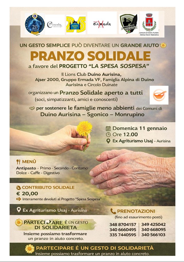 11 gennaio 2026 (Non a Borgo San Mauro ma nell’ex agriturismo Usaj di AURISINA) ore 12.00 PRANZO SOLIDALE a favore del Progetto “LA SPESA SOSPESA” UN GESTO SEMPLICE PUÒ NUTRIRE MOLTE FAMIGLIE il Lions Club Duino Aurisina, Ajser 2000, Gruppo Ermada VF, Famiglia Alpina di Duino Aurisina e Circolo Duinate con il patrocinio del Comune di Duino Aurisina Obcina Devin Nabrezina organizzano un Pranzo Solidale aperto a tutti (soci, simpatizzanti, amici e conoscenti) per sostenere le famiglie meno abbienti dei Comuni di Duino Aurisina Sgonico e Monrupino. L’iniziativa è promossa in occasione della Settimana Mondiale del Service per la Lotta alla Fame dei Lions e in concomitanza con l’anniversario di omologazione del Lions Club Duino Aurisina. Il ricavato contribuirà concretamente al Progetto “Spesa Sospesa”: buoni spesa per il Supermercato Conad Super Store di Duino e distribuiti tramite i Servizi Sociali del Comune di Duino Aurisina. Domenica 11 gennaio alle ore 12 con un contributo per l’evento di 20 euro. Prenotazioni (fino ad esaurimento posti) 348 8704157 Massimo 349 4255042 Lidia 340 6664095 Andrea 335 7440595 Giuly 340 5665103 Lucia