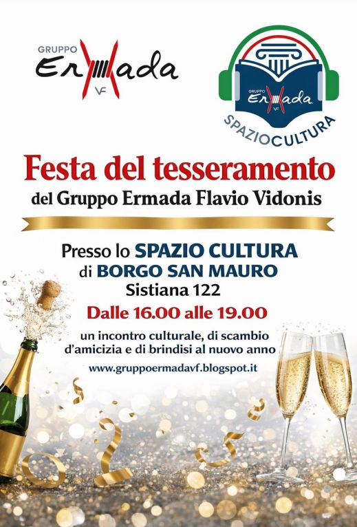 Nell’area esterna dello Spazio Cultura (tempo permettendo) dalle 16.00 alle 19.00 la Festa del Tesseramento del Gruppo Ermada Flavio Vidonis, un incontro di amicizia per brindare al nuovo anno.