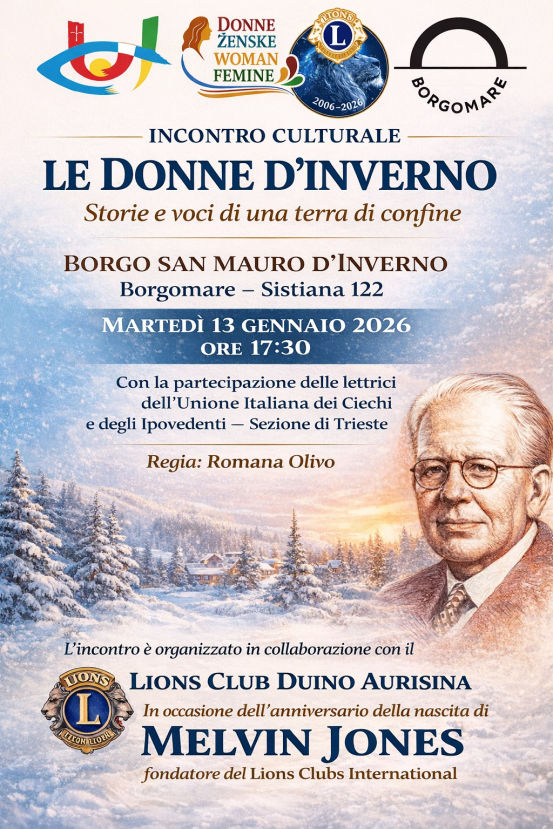 13 gennaio 2026 presso il bar BORGOMARE di Borgo San Mauro alle 17.30Incontro Culturale “Le donne d’inverno” Storie e voci di una terra di confine – con l’Unione Italiana Ciechi e Ipovedenti di Trieste e l’Università della Terza Età con regia di Romana Olivo. L’incontro è dedicato all’anniversario della nascita di Melvin Jones fondatore del Lions Club International e Helen Keller È conosciuta per essere stata la prima persona sordo-cieca a essersi laureata.[1] Alla sua vicenda, e a quella dell’istitutrice che le insegnò a interagire con il mondo esterno così da poter affrontare gli studi fino alla laurea.