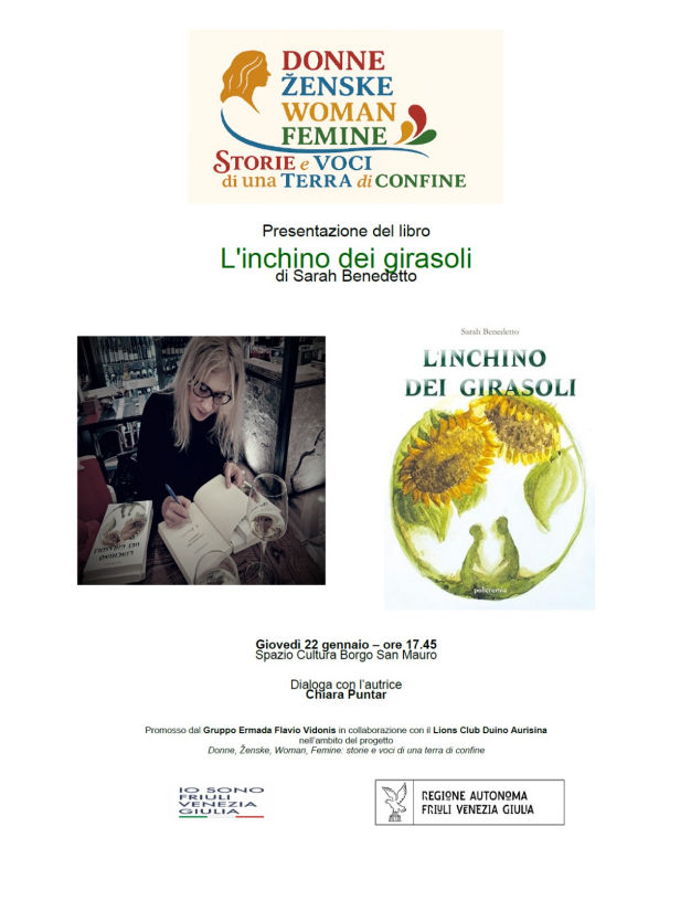 22 gennaio 2026 presso lo SPAZIO CULTURA di Borgo San Mauro alle 17.45 La presentazione del libro di Sarah Benedetto “L’inchino dei Girasoli” – inserito nel progetto “Donne, Ženske, Woman, Femine: storie e voci di una terra di confine” con il sostegno della Regione FVG. Dialogherà con l’autrice Chiara Puntar.