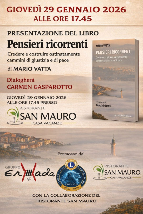 29 gennaio 2026 presso il RISTORANTE SAN MAURO di Borgo San Mauro ore 17.45 Presentazione del libro “Pensieri ricorrenti – credere e costruire ostinatamente cammini di giustizia e di pace ” con Don Mario Vatta che dialogherà con la scrittrice Carmen Gasparotto.