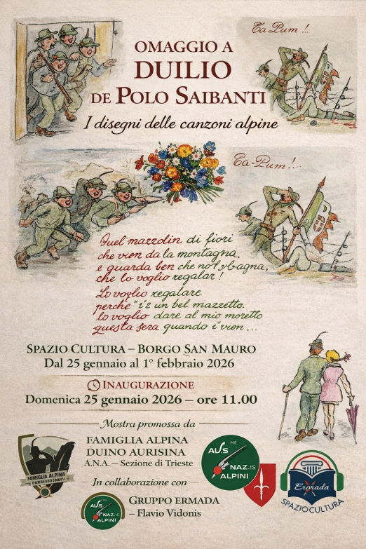 25 gennaio 2026 presso lo SPAZIO CULTURA di Borgo San Mauro ore 11.00Inaugurazione mostra “Omaggio a Duilio De Polo Saibanti – i disegni delle Canzoni Alpine” – promosso in collaborazione con la Famiglia Alpina di Duino Aurisina e Ana Trieste in occasione della Giornata dell’Orgoglio alpino, l’evento che celebra il valore e il sacrificio degli alpini, rappresentando il coraggio e l’impegno verso il Paese.