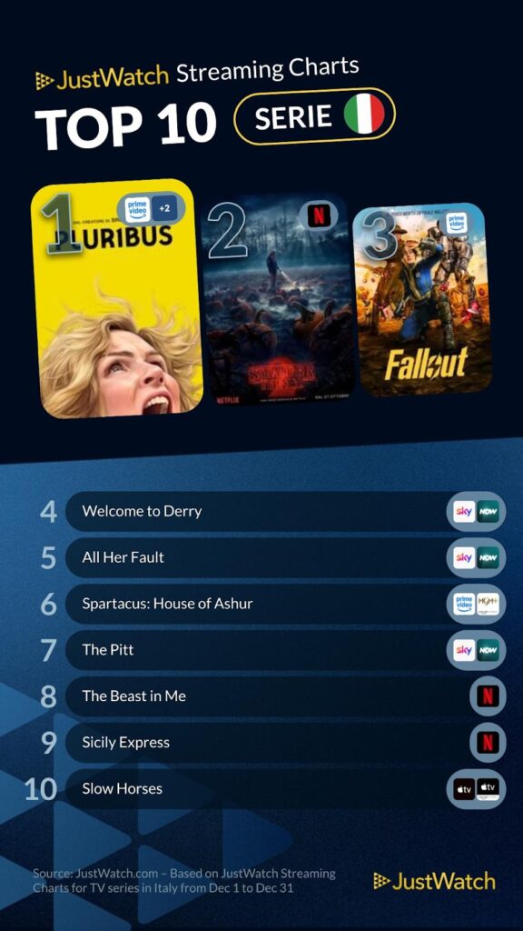 A dicembre a mantenere saldamente la vetta è Pluribus, seguita dal ritorno trionfale di Stranger Things, mentre Fallout conquista il podio grazie alla sua ambientazione post-apocalittica.