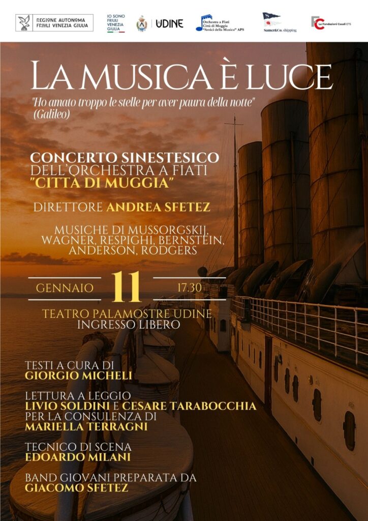Queste le date degli altri spettacoli: 16 gennaio ore 20.30 Muggia, teatro Verdi; 8 febbraio ore 16.30 e 18.30 Trieste, teatro Miela (ingresso 16 euro, prevendite presso la biglietteria del teatro (tel. 0403477672) tutti i giorni dalle 17.00 alle 19.00 e Ticketpoint di Galleria Rossoni (Corso Italia 6/C) da lunedì a sabato con orario 8.30-12.30 e 15.00-19.00, nonché online su www.vivaticket.com); 20 marzo ore 20.30 Gorizia, Kulturni Dom; 22 marzo ore 17.30 Pordenone, Auditorium Concordia; 16 aprile ore 20.00 Duino, Auditorium del Collegio del Mondo Unito e 18 aprile ore 20.30 Tolmezzo, teatro Candoni.Il progetto gode del contributo della Regione Autonoma Friuli Venezia Giulia – IO SONO FRIULI VENEZIA GIULIA, del sostegno de Le Fondazioni Casali e della Samer & Co. Shipping e del patrocinio dei Comuni di Udine e Muggia.”Iniziamo il 2026 con una rassegna, patrocinata dalla Regione, dove la musica diventa un mezzo per lanciare messaggi significativi alla comunità. In questo caso, in particolare, emerge il parallelismo tra le difficoltà incontratedagli emigranti che, nel secolo scorso, lasciarono la nostra terra per attraversare l’oceano in cerca di fortuna e gli ostacoli che le persone con disabilità affrontano ogni giorno. Ringrazio, a nome dell’Amministrazione regionale, l’Orchestra a fiati Città di Muggia e i giovani musicisti della Piccola orchestra ritmica che daranno vita a questo spettacolo multisensoriale” ha esordito l’assessore regionale alle Autonomie locali, Pierpaolo Roberti.