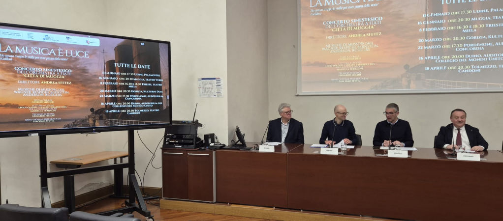 È stato presentato oggi a Trieste nella Sala Predonzani della Regione Autonoma Friuli Venezia Giulia dall’Assessore alle Autonomie Locali, Pierpaolo Roberti alla presenza di Giacomo Sfetez, ideatore dello spettacolo sinestetico (che ha portato i saluti di Ferdinando Parlato, Presidente dell’Orchestra a Fiati Città di Muggia APS-ETS), dell’autore dei testi, Giorgio Micheli e del presidente fondatore della Fondazione ALIA e pianista Vincenzo Zoccano il progetto “La Musica è Luce”, che prevede un ciclo di otto concerti a ingresso libero (tranne quello al teatro Miela di Trieste dell’ 8 febbraio, dov’è prevista la partecipazione straordinaria di Alesio Colautti) in sette località regionali in programma dall’11 gennaio al 18 aprile 2026.
