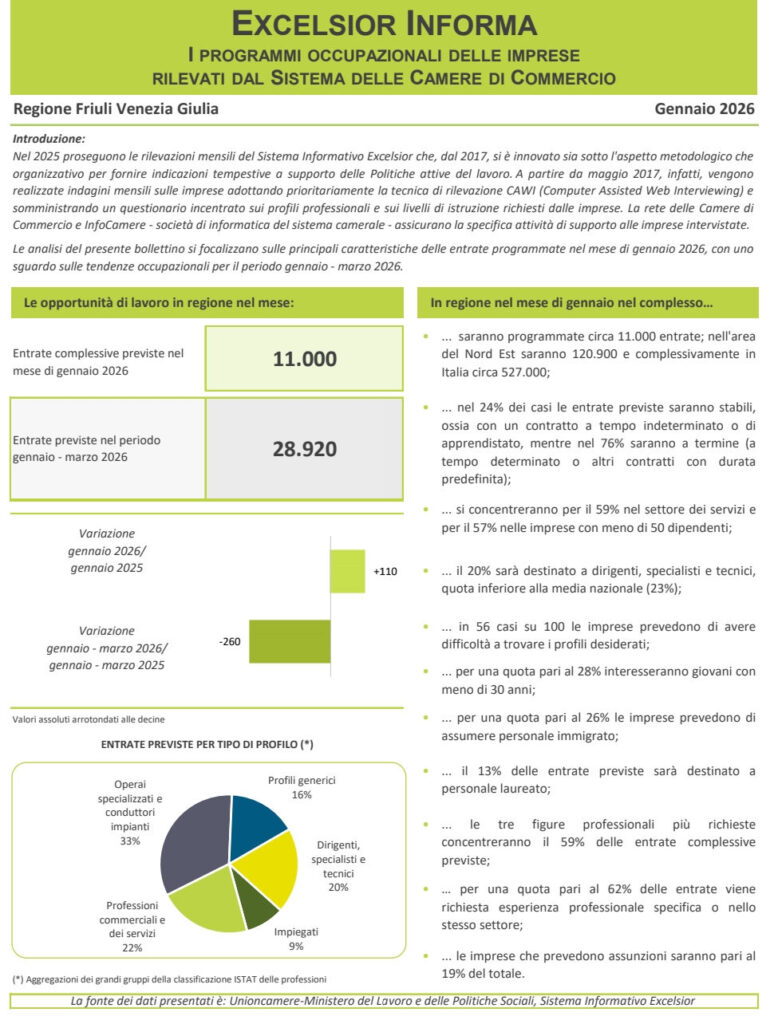 “Iniziare l’anno con una tendenza in crescita per gennaio ci dà fiducia – commenta il presidente della Cciaa Pn-Ud Giovanni Da Pozzo -. Certo, non dobbiamo sottovalutare il momento geopolitico internazionale quanto mai mutevole e che si riflette anche sulle previsioni di assunzione dell’intero prossimo trimestre, gennaio-marzo, in cui quasi tutti i settori prevedono diminuzione, tranne i servizi e in particolare il turismo che continuano fortunatamente a prevedere crescita e a trainare anche a livello occupazionale». Per il presidente Da Pozzo, “è fondamentale ribadire anche con l’anno nuovo l’importanza dell’alta formazione tecnico-scientifica e la formazione di professionalità specialistiche qualificate: come enti camerali siamo in prima linea per sostenere scuole come gli Its, che permettono di formare giovani competenti in comparti in cui le imprese hanno necessità di assumere”.