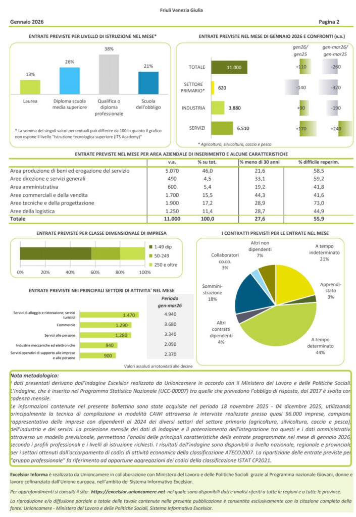 Per il Friuli Venezia Giulia la tendenza è con il segno “+” e circa un quinto delle imprese risulta intenzionato ad assumere per un totale di circa 11.000 entrate per circa ¼ con contratto a tempo indeterminato o di apprendistato. Le assunzioni avranno luogo soprattutto nel settore dei Servizi (6.510); 3.010, invece, saranno le entrate nell’industria manifatturiera e le public utilities, 870 quelle nelle Costruzioni.