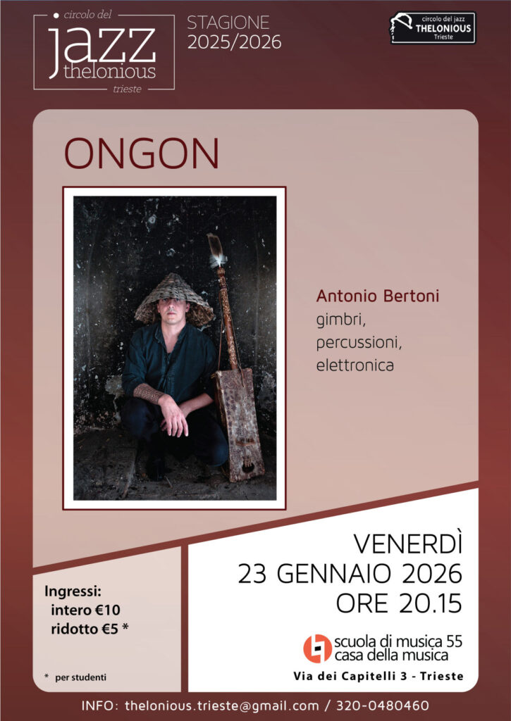 Venerdì 23 gennaio alle ore 20.15 presso la Casa della Musica in via dei Capitelli 3 a Trieste, il Circolo del Jazz Thelonious presenta ONGON (Antonio Bertoni – gimbri, dvina, basso, chitarra, percussioni, elettronica)