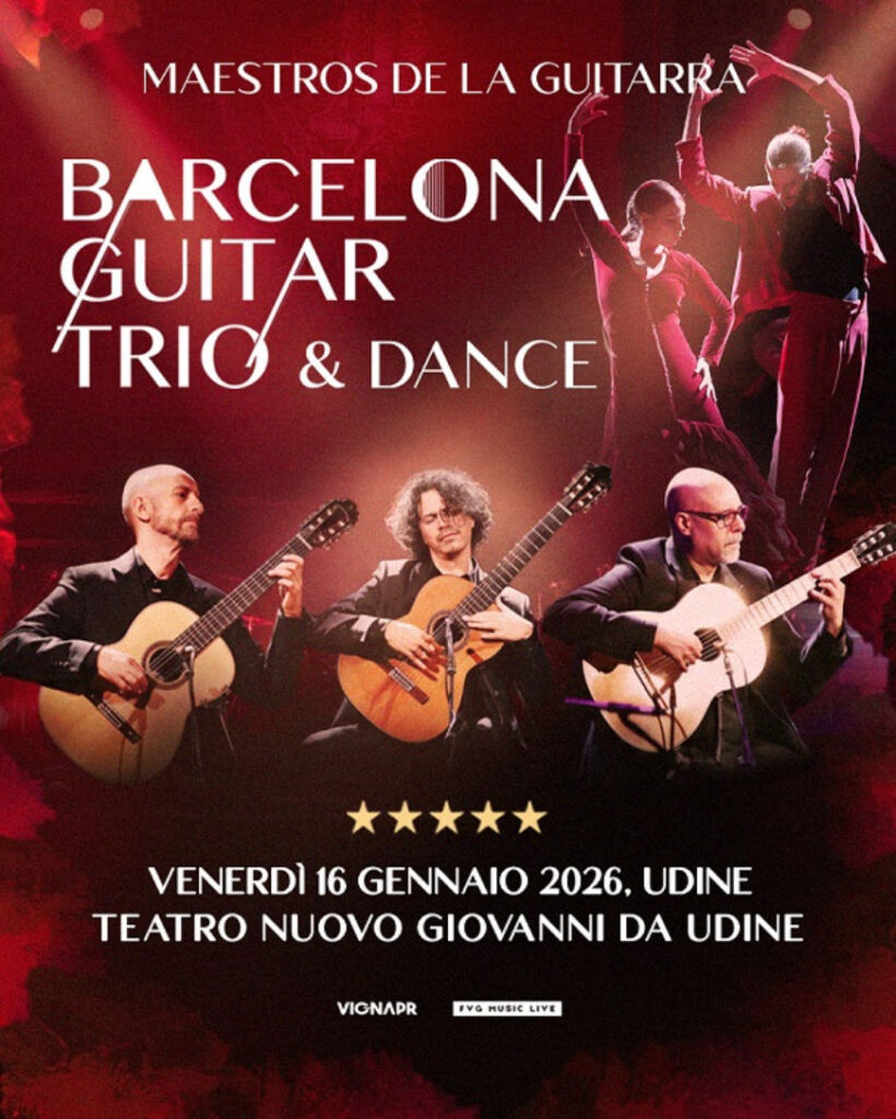 VignaPR e FVG Music Live inaugurano il 2026 dei concerti e grandi eventi live in Friuli Venezia Giulia con il BARCELONA GUITAR TRIO & DANCE, uno degli spettacoli più apprezzati del panorama musicale crossover, nonché uno dei progetti più apprezzati della musica iberica nel mondo – dall’Europa all’America Latina, fino all’Asia – che ha conquistato il pubblico e la critica grazie a un linguaggio universale, in cui la tecnica impeccabile si fonde con una profonda sensibilità artistica.