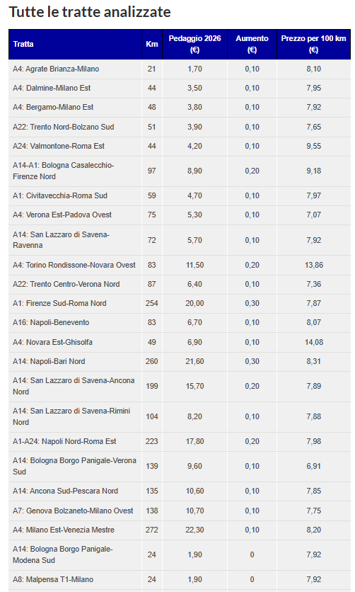 Un indicatore particolarmente utile per valutare il peso dei pedaggi è il costo ogni 100 km, che consente di confrontare tratte di lunghezza diversa. Lo abbiamo calcolato dividendo il costo del pedaggio per la lunghezza della tratta considerata e moltiplicando il risultato per 100. Da questo punto di vista, l’indagine mette in luce situazioni critiche: la tratta Novara Est-Milano Ghisolfa supera i 14 euro ogni 100 km, mentre la Torino Rondissone-Novara Ovest si avvicina ai 14 euro. Anche in diverse tratte del Lazio, della Campania e lungo l’Adriatico il costo supera stabilmente i 10 euro ogni 100 km, livelli che collocano molte autostrade italiane tra le più care, indipendentemente dagli aumenti entrati in vigore nel 2026.
