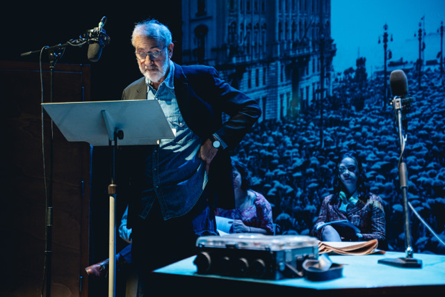 “26 ottobre. Un mare di ombrelli” di Gianni Gori, racconta il giorno del ricongiungimento di Trieste all’Italia secondo una formula particolare: è scritto in forma di radiodramma – ed è stato trasmesso sulle frequenze Rai a ottobre 2024 – ma sulla scena viene “rappresentato” nel suo farsi, come se il pubblico potesse assistere al “dietro le quinte”.