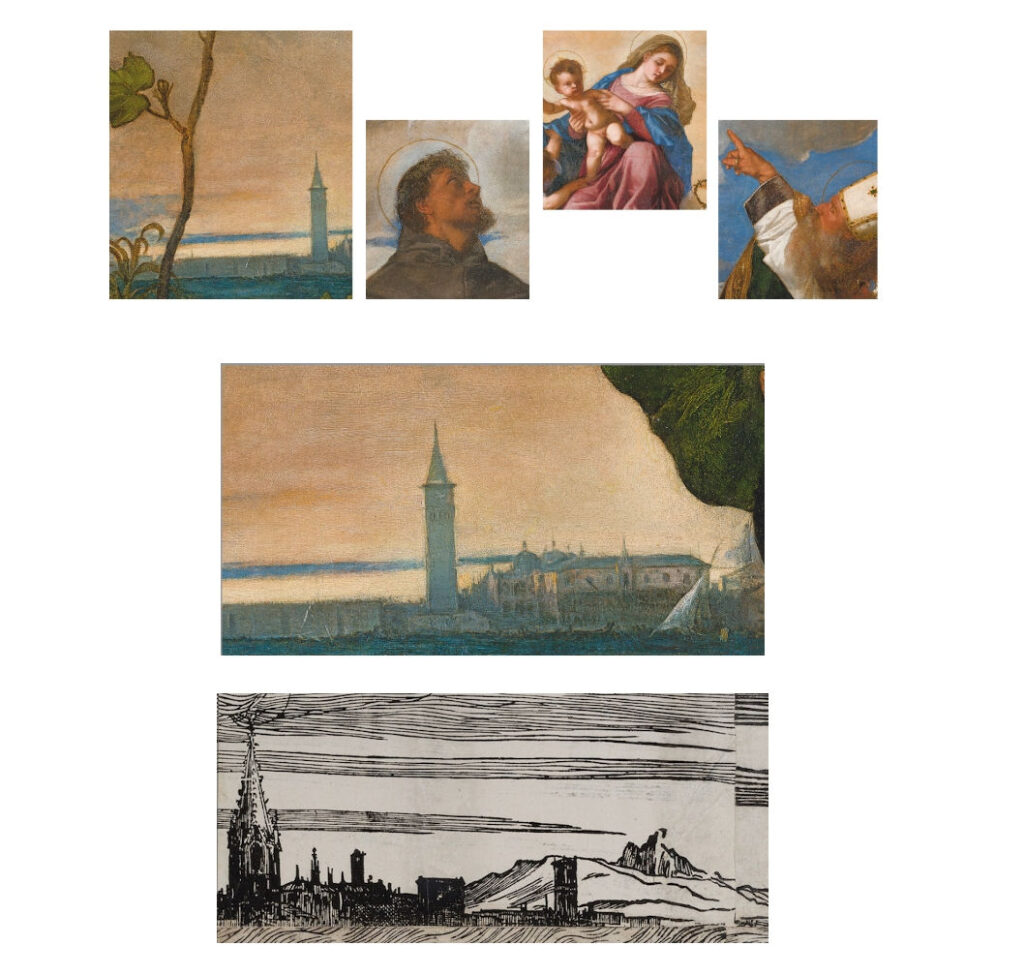 Due opere apparentemente diverse per tecnica e funzione, l’una di destinazione pubblica l’altra riservata a visioni più raccolte, eppure con tanti punti di contatto: dalla raffigurazione di una città che emerge dall’acqua o dalla sua laguna, alla struttura compositiva “a triangolo” comune alle due opere; dal significato specifico affidato ai paesaggi e alla luce determinanti per la comprensione dell’opera, ai riferimenti politici sottesi in entrambi i lavori.