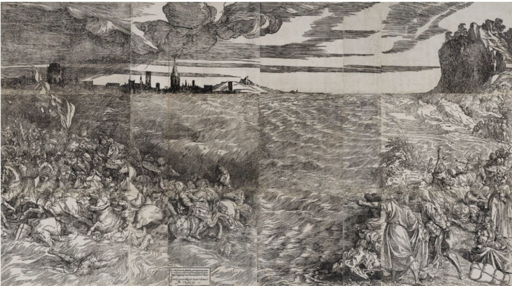 Dall’altro, la grandiosa xilografia con la “Sommersione dell’esercito del Faraone nel Mar Rosso”, incisa da un anonimo intagliatore, su disegno di Tiziano eseguito nel 1515 c., e conservata ai Musei Civici di Bassano del Grappa: una stampa in dodici fogli dalle dimensioni straordinarie – 120 x 220 centimetri – considerata una delle più spettacolari xilografie di tutti i tempi.