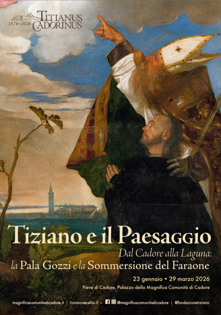 La prima mostra “Tiziano e il Paesaggio. Dal Cadore alla Laguna: la Pala Gozzi e la Sommersione del Faraone” presso il Palazzo della Magnifica Comunità del Cadore dal 23 gennaio al 29 marzo 2026 inserita nell’ambito dell’Olimpiade Culturale di Milano-Cortina 2026 – con il patrocinio del Ministero dei Beni Culturali e della Provincia di Belluno, il fondamentale sostegno della Fondazione Cariverona, il contributo della Regione del Veneto e del Consorzio dei Comuni Bim Piave di Belluno, partner la Rete Museale Cadore Dolomiti e il mensile Il Cadore, la mediapartnership del Gruppo NEM e del Corriere delle Alpi – pone vis a vis per la prima volta due monumentali opere chiave della produzione tizianesca rappresentative del ruolo “rivoluzionario” assegnato dal maestro ai paesaggi e alla viva natura.