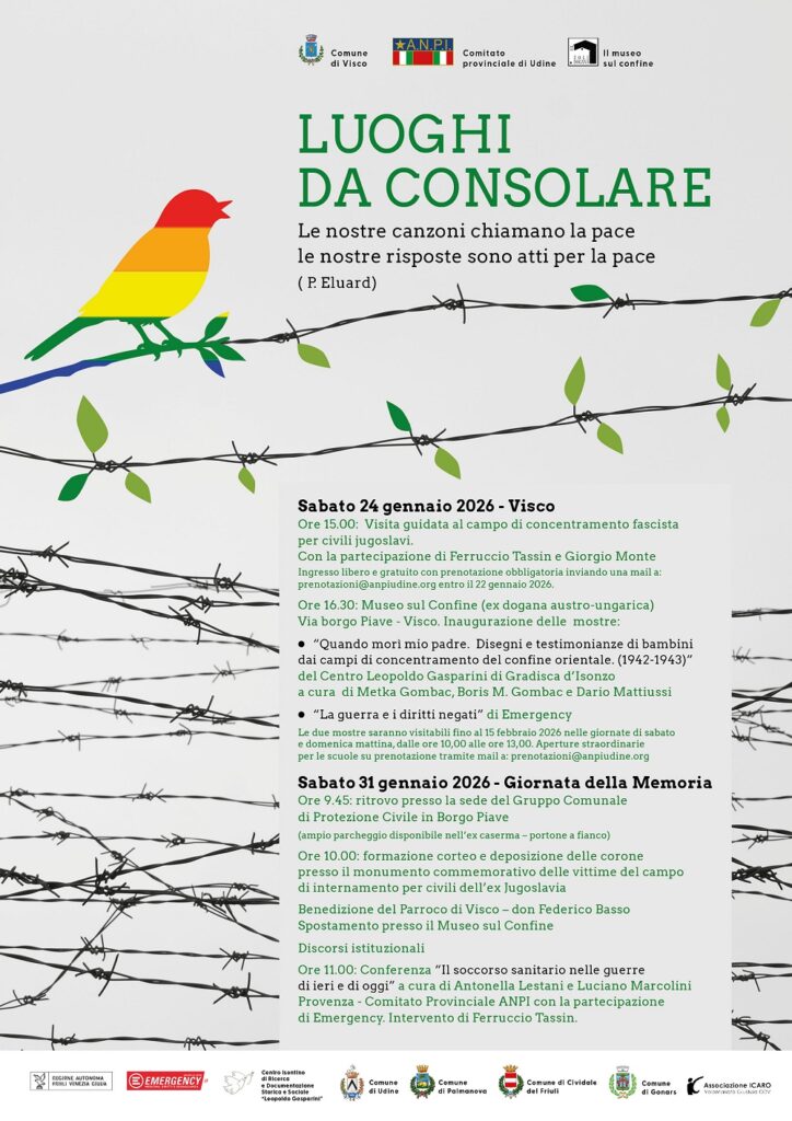 Con una visita guidata al campo di concentramento fascista e l’inaugurazione di due mostre al Museo sul Confine, sabato 24 gennaio partiranno gli eventi realizzati dall’Anpi – Comitato provinciale di Udine con il Comune di Visco. Le iniziative, inserite nell’ambito del progetto “Luoghi da consolare”, culmineranno sabato 31 gennaio con le celebrazioni ufficiali e la conferenza “Il soccorso sanitario nelle guerre di ieri e di oggi”.
