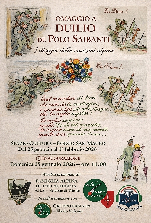 L’esposizione è promossa dal Gruppo Ermada Flavio Vidonis, in collaborazione con la Famiglia Alpina Duino Aurisina e l’ANA – Sezione di Trieste, e intende rendere omaggio a Duilio de Polo Saibanti, figura di straordinario valore umano, culturale e militare, Capitano del 4° Reggimento Artiglieria Alpina Cunense e profondo interprete dello spirito alpino.