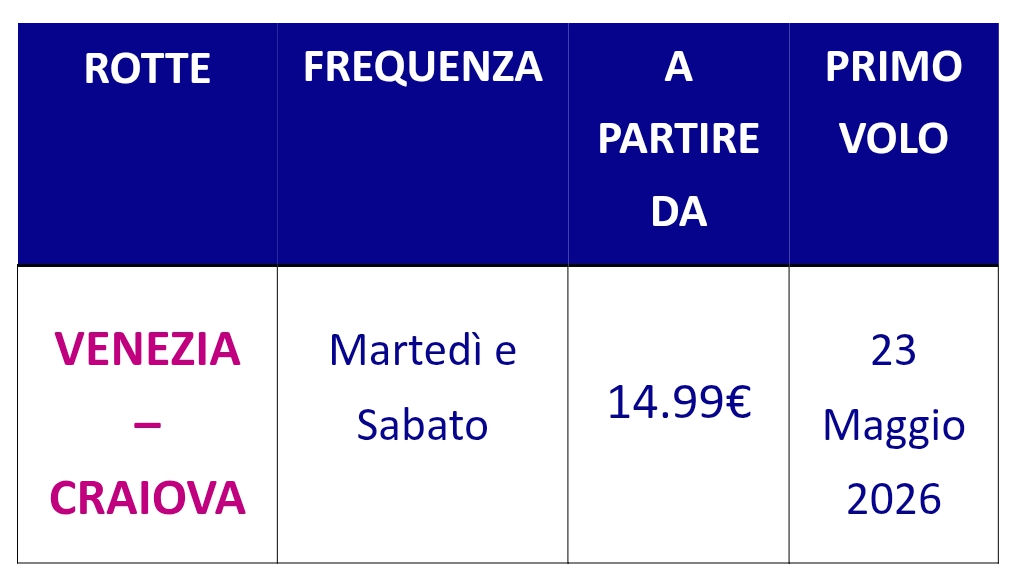 Venezia, 22 Gennaio 2026 – Wizz Air, la compagnia aerea che nel 2025 ha fatto volare oltre 21 milioni di passeggeri in Italia, e SAVE rafforzano ulteriormente il loro legame strategico annunciando la nuova rotta Venezia – Craiova a partire dal 23 maggio.