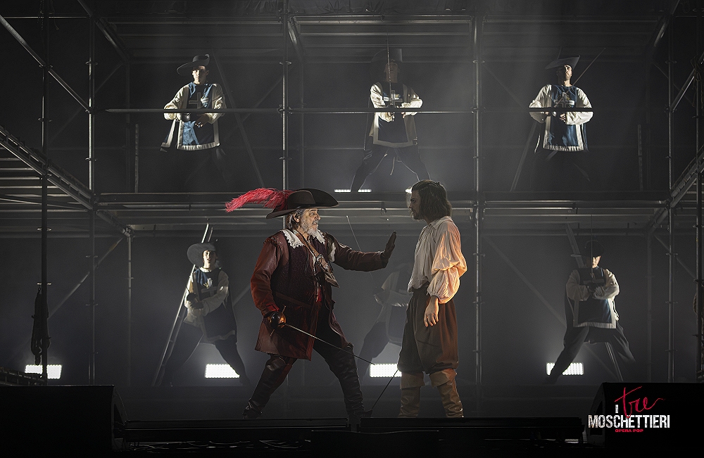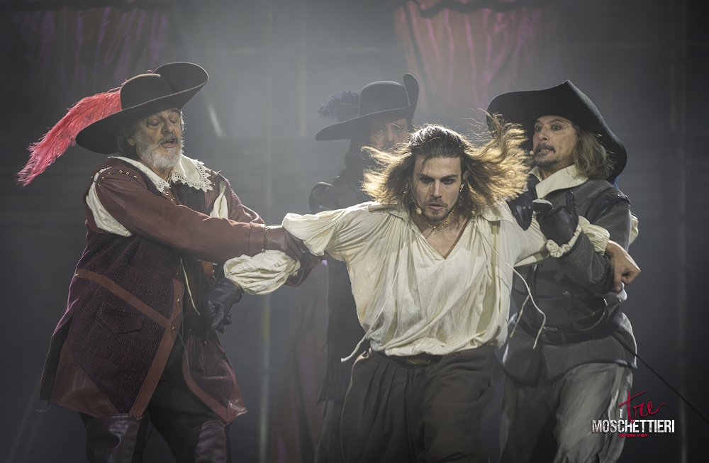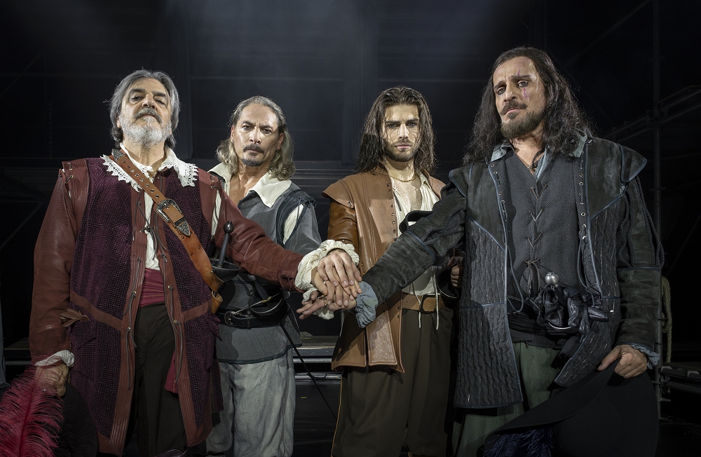 L’adattamento di Peparini parte da una scena di fabbrica, grigia e spersonalizzante, per aprirsi magicamente in un mondo epico e romantico. Il viaggio nel romanzo di Alexandre Dumas prende vita attraverso uno stile registico audace, momenti corali dal grande impatto emotivo e coreografie, curate da Veronica Peparini e Andreas Müller, che trasformano ogni duello in una danza d’azione teatrale grazie alla presenza dei performer della Peparini Academy. Un mix suggestivo in grado di creare quadri scenici che restano impressi nella memoria, mentre le musiche di Giò Di Tonno – potenti, originali, mai scontate – accompagnano e rafforzano ogni svolta narrativa, dando voce all’interiorità dei personaggi. A guidare il pubblico nel cuore dell’avventura, un trio che ha già fatto la storia del musical italiano: Giò Di Tonno (Athos), Vittorio Matteucci (Porthos), Graziano Galatone (Aramis), affiancati da Sea John (D’Artagnan), Camilla Rinaldi (Milady), Beatrice Blaskovic (Costanza) e un cast giovane e talentuoso che dà corpo a un racconto ricco di passione, vendetta, amore e onore.