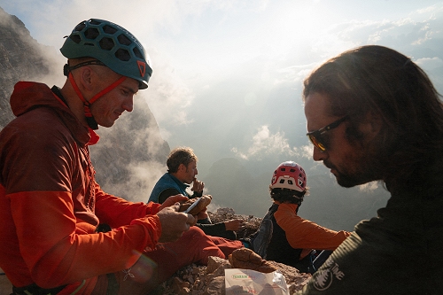 Le due cordate protagoniste erano composte da Marco Bergamo, Lorenzo Bellenzier, Matteo Pavana, assieme a Baù, Beber e Confortin (autore delle riprese in parete). Settimo di cordata, Leonardo Vianello che ha seguito la scalata con il drone, dal rifugio Tissi.