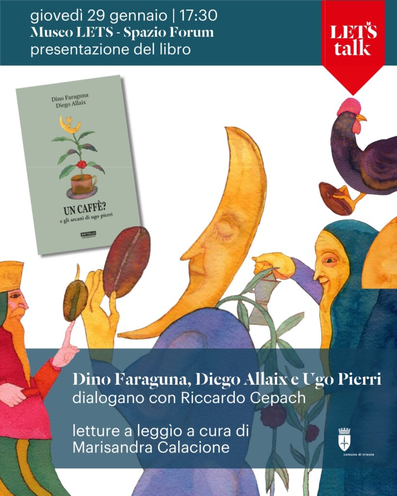 Giovedì 29 gennaio alle ore 17:30 si terrà, nello Spazio Forum di Museo LETS, la presentazione del volume “Un caffè? e gli arcani di Ugo Pierri” di Dino Faraguna e Diego Allaix con le illustrazioni di Ugo Pierri, edito da Battello Stampatore.