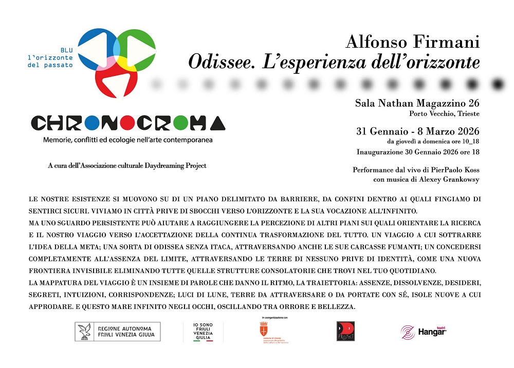 Venerdì 30 gennaio alle ore 18 nella Sala Nathan in Porto Vecchio – Porto Vivo inaugurazione della mostra di Alfonso Firmani “Odissee. L’esperienza dell’orizzonte”. La mostra è realizzata a cura dell’Associazione Culturale DayDreaming Project e sarà visitabile dal 31 gennaio all’8 marzo 2026, con i seguenti orari da giovedì a domenica dalle ore 10 alle ore 18.
