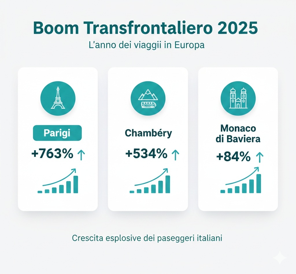 Trainline, la piattaforma leader in Europa per la prenotazione di viaggi in treno e pullman, pubblica la sua analisi annuale sui dati di mercato, rivelando i cambiamenti significativi nel comportamento dei viaggiatori italiani nel 2025. Grazie alla sua posizione unica di aggregatore, che riunisce l’offerta di oltre 300 operatori ferroviari e di pullman in più di 40 paesi, l’analisi di Trainline offre un panorama completo dei flussi di viaggio, distinguendosi dai dati parziali dei singoli vettori. Dall’analisi emergono tre macro-trend: un’accelerazione senza precedenti verso le destinazioni internazionali, con una crescita di passeggeri verso Parigi del 763%; una profonda riconfigurazione del turismo domestico verso mete di prossimità, guidata da destinazioni montane come la piemontese Oulx (+84%); e l’affermazione del risparmio intelligente, con la possibilità per i viaggiatori di ottenere sconti fino al 59% pianificando in anticipo.