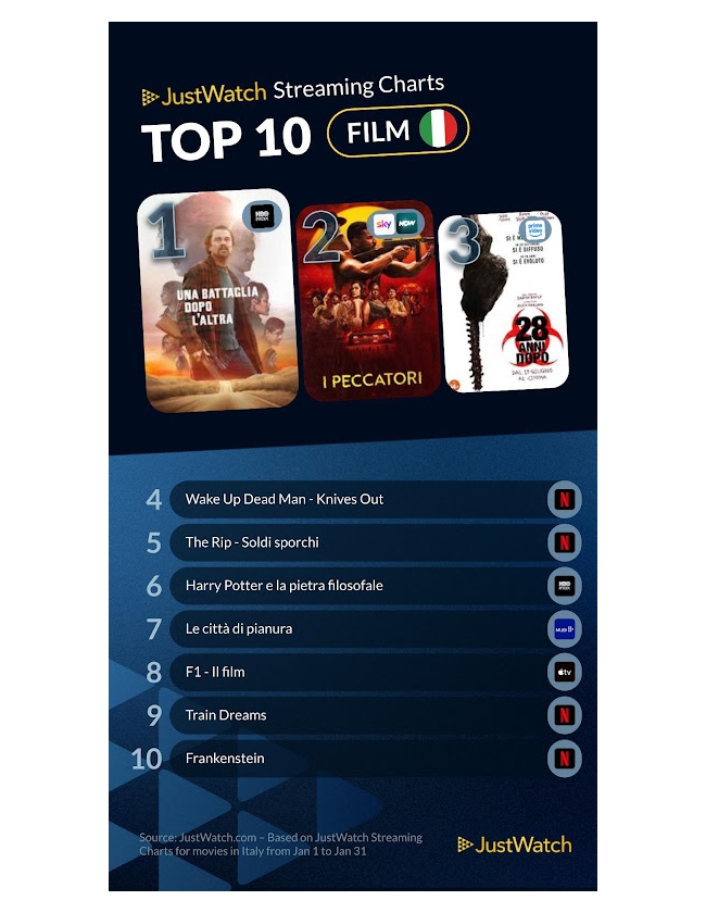 A gennaio 2026 a dominare il ranking dello streaming in Italia è Una battaglia dopo l’altra, seguito da I peccatori e da 28 Anni Dopo, che sale sul podio confermando l’interesse del pubblico per le atmosfere post-apocalittiche.