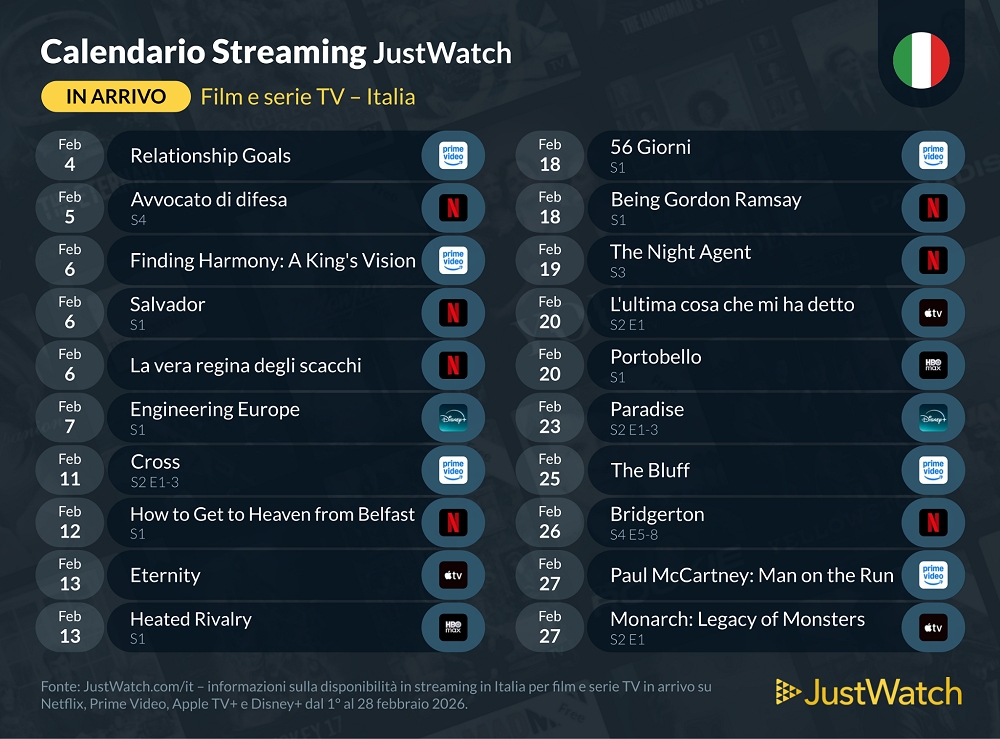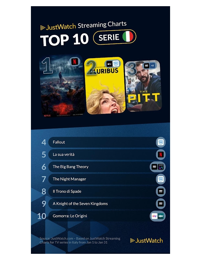 Il primo mese del 2026 si è concluso da poco e, come ogni mese, JustWatch, la più grande guida al mondo di contenuti in streaming, ha pubblicato la classifica mensile dei film e delle serie tv più gettonate in Italia a gennaio 2026 nella quale sono indicati anche i cambiamenti di posizione rispetto al mese precedente.