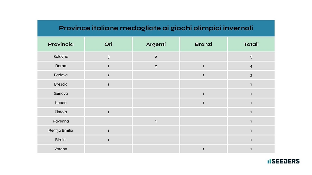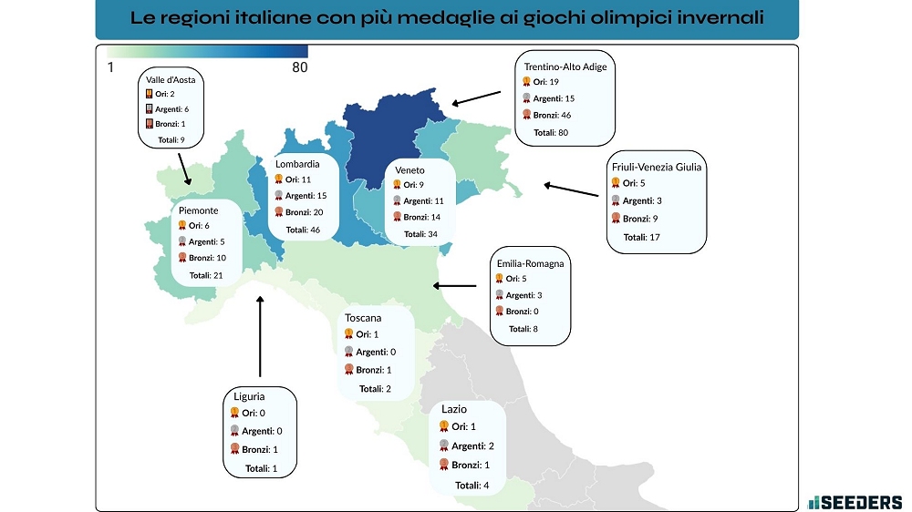 Mentre manca sempre meno alla nuova edizione dei Giochi Olimpici Invernali, Seeders ha realizzato uno studio che ricostruisce la “geografia” delle medaglie italiane: quali regioni, quali province e quali atleti hanno inciso di più nella storia azzurra ai Giochi Invernali. Il risultato è una fotografia netta, fatta di roccaforti alpine, specializzazioni sportive e campioni in grado di spostare da soli gli equilibri di interi territori.