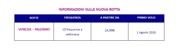 “Oggi non annunciamo solo un nuovo volo, ma il rafforzamento di un legame profondo con Venezia e il suo aeroporto,” ha dichiarato Salvatore Gabriele Imperiale, Corporate Communications Manager di Wizz Air. “Dopo il recente annuncio della rotta dal capoluogo veneto alla città rumena di Craiova, continuiamo a costruire insieme a SAVE un’offerta che metta al centro il viaggiatore veneziano, offrendogli adesso anche la possibilità di raggiungere Palermo con una frequenza che non ha eguali e a tariffe sempre più accessibili. La nostra flotta A321neo assicura inoltre che questo avvenga con il maggior comfort e la più ampia scelta possibile. Venezia e Palermo non sono mai state così vicine e non vediamo l’ora di vedere a bordo i nostri passeggeri e accompagnarli nel loro viaggio. Let’s WIZZ, Venezia!”.