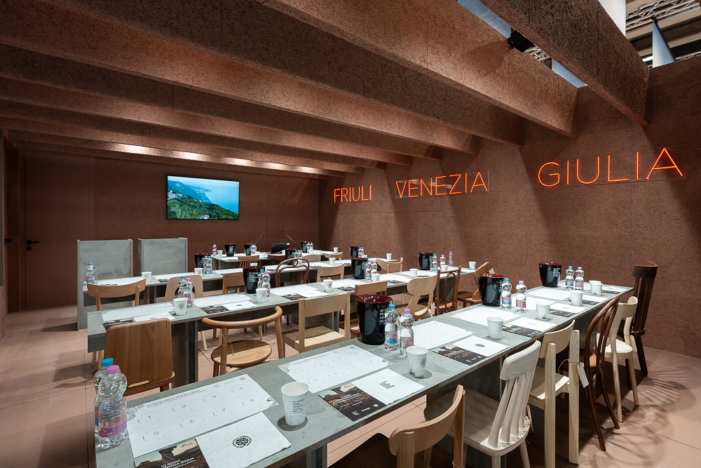 Lo spazio “Io sono Friuli Venezia Giulia” con il claim “Connessioni d’eccellenza” intreccia vino, cultura, territorio e laboriosità di una terra vocata all’eccellenza. Realizzato con materiali sostenibili e il contributo di artigiani locali, nasce per raccontare il sistema vino connettendolo con il suo territorio e valorizzare la ricchezza del Friuli Venezia Giulia, una somma di identità che dà forma alla narrazione della regione. Il modello espositivo è stato concepito per essere flessibile, componibile e replicabile, per rappresentare la regione nei contesti fieristici nazionali e internazionali con un’immagine elegante, coordinata e univoca. Il progetto dello stand, “The Power of Contrasts – the immersive concept of FVG Italian Region at Vinitaly 2025”, ideato dallo studio udinese Visual Display, ha ottenuto il Red Dot Award: Brands & Communication Design 2025, tra i massimi riconoscimenti internazionali del settore.