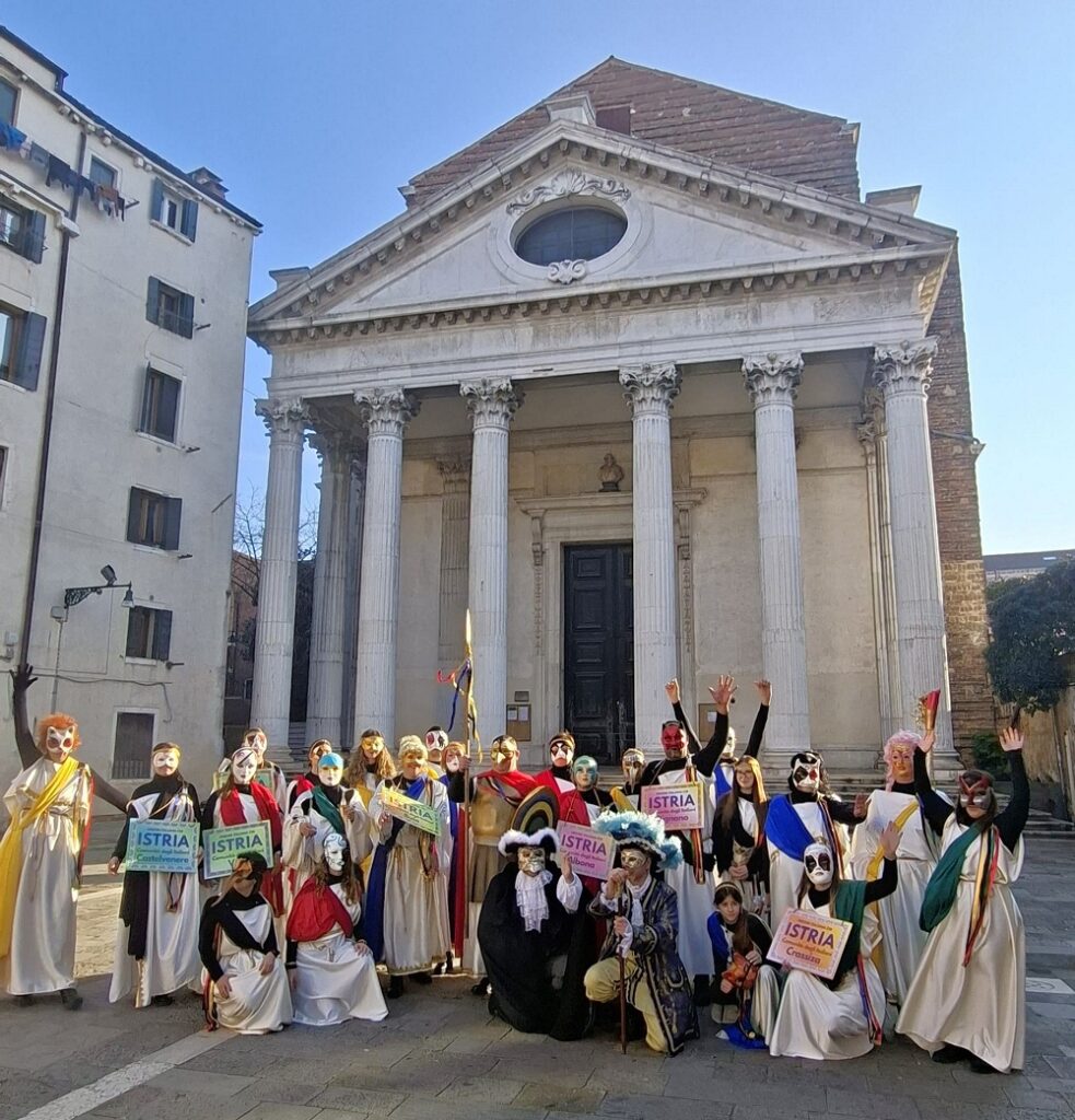 La presenza veneziana in Istria, tra il XIII e il XVIII secolo, ha modellato città, istituzioni e paesaggi. Crassiza entrò nell’orbita veneziana già nel 1343. Albona conserva il leone di San Marco inciso nel 1587. Valle, Dignano e Gallesano furono integrate stabilmente nei domini veneti dal XV secolo. Buie, Castelvenere e Momiano condivisero magistrature, statuti, lingua amministrativa e circuiti commerciali. Venezia garantiva difesa, infrastrutture e governo, mentre l’Istria forniva legname, pietra, olio, vino, carni e pesce, sale e altre risorse fondamentali, contribuendo alla potenza marittima della Serenissima. Questi legami storici spiegano perché oggi il Carnevale diventa importante occasione di riconnessione culturale con il progetto “Le due sponde” in attuazione dell’Intesa Europa Adriatica Nordest siglata alla Fenice nell’ottobre 2023.