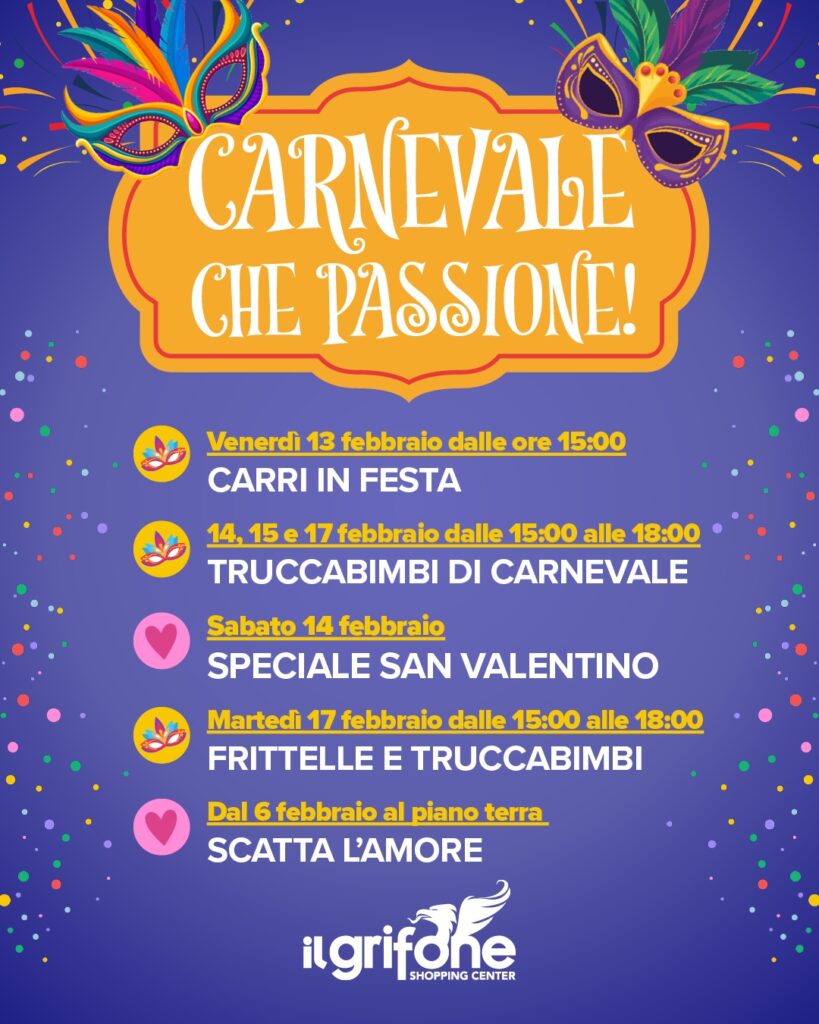 Il mese di febbraio al Centro Commerciale Il Grifone di Bassano del Grappa si sviluppa attorno a un calendario di appuntamenti che intreccia Carnevale, San Valentino e iniziative culturali e sociali, con proposte rivolte in particolare a famiglie e bambini.