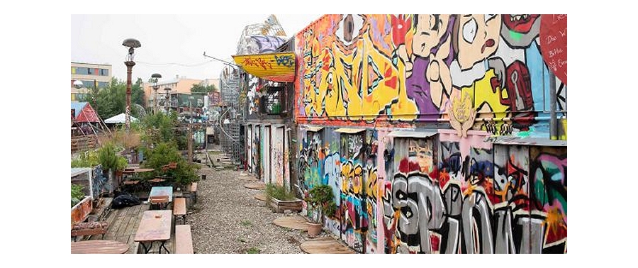 Il cuore del complesso è formato da vecchi convogli della metropolitana di Monaco, ristrutturati e riconvertiti, affiancati da un vagone ferroviario, cabine sospese e una gru monumentale decorata con sfere da discoteca. Tutto intorno, container marittimi dipinti con graffiti ospitano i laboratori di artisti e artigiani, dando vita a un vero e proprio microcosmo urbano.