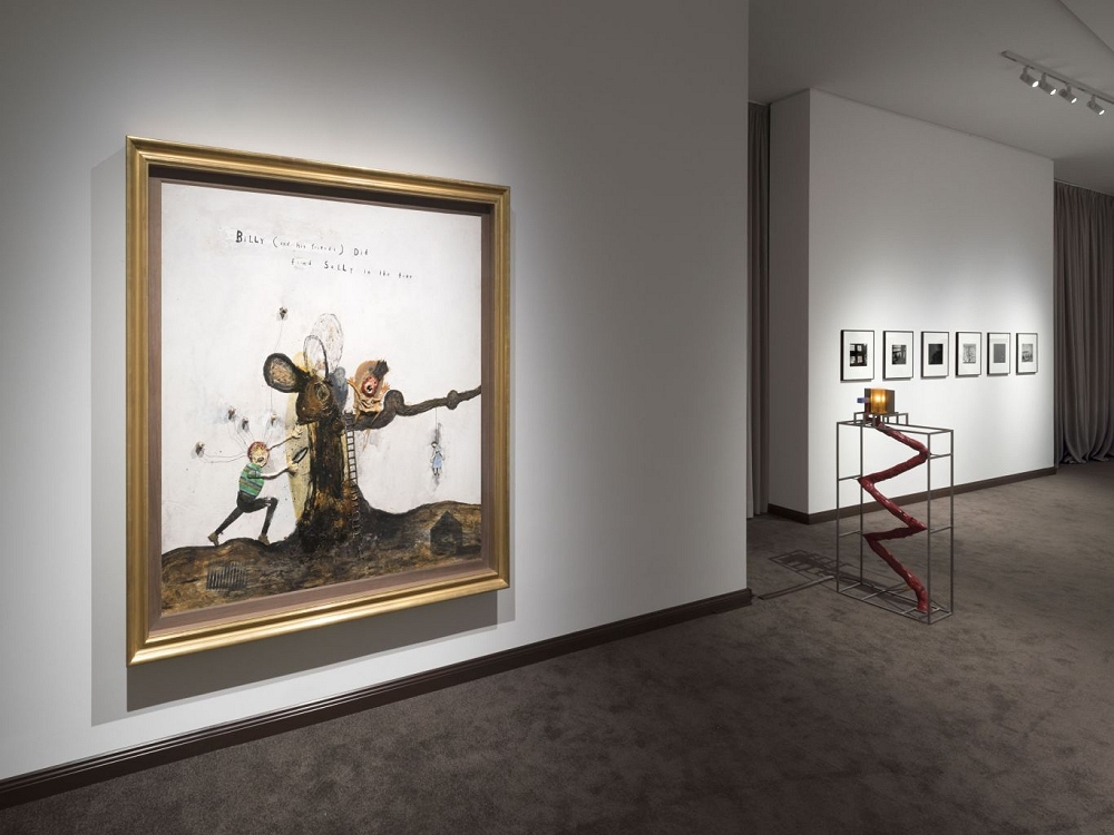 Lynch, uno dei più importanti pensatori creativi del nostro tempo, si considerava un artista visivo. Le opere pittoriche, popolate da immagini enigmatiche e perturbanti, dialogano con il linguaggio del surrealismo e integrano spesso elementi testuali e narrativi. Ne emerge una tensione costante, un senso di inquietudine che riflette le zone più profonde e irrazionali della psiche umana, tema centrale anche nella sua produzione cinematografica. Gli acquerelli, caratterizzati da cromie intense e riconoscibili – rossi, blu e gialli vibranti – sono esposti in cornici progettate dallo stesso Lynch. La sezione scultorea comprende tre lampade verticali realizzate con materiali industriali e naturali, capaci di diffondere una luce sospesa tra sogno e disagio.