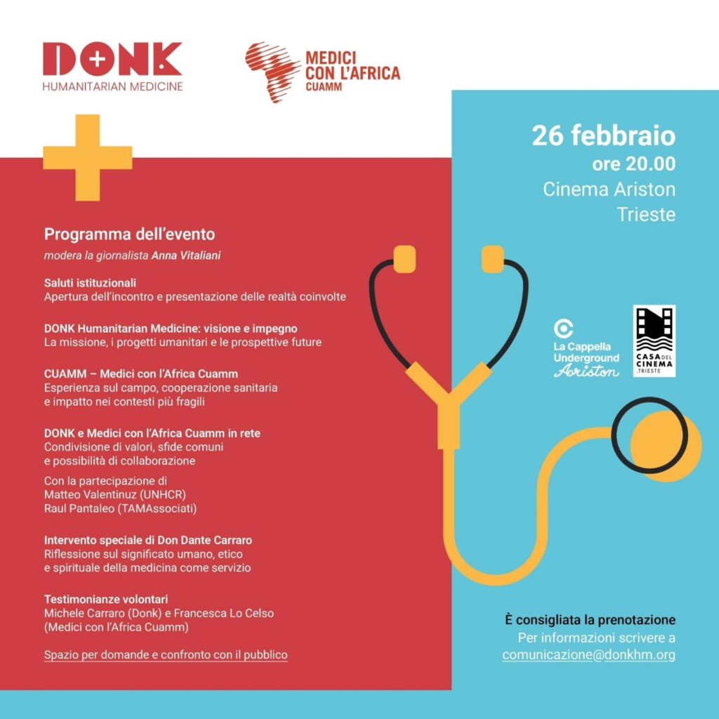 Giovedì 26 febbraio, alle ore 20.00, presso il Cinema Ariston di Trieste, si terrà l’evento “La medicina che cura, accompagna, testimonia”, promosso da DonK HM Humanitarian Medicine in collaborazione con Medici con l’Africa Cuamm, nell’ambito del Festival Salute!