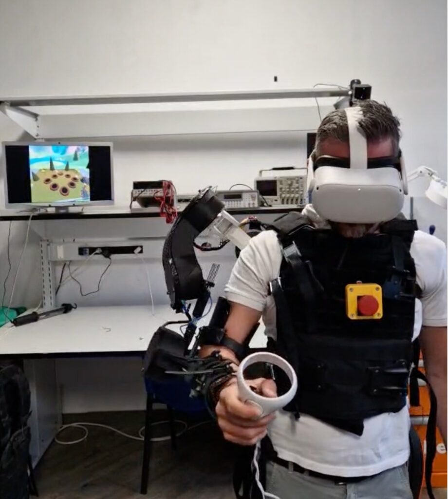 Frutto della cooperazione fra Università Cusano, Università La Sapienza, Università degli Studi della Tuscia di Viterbo, Università degli Studi di Napoli Federico II e Inail, il dispositivo esoscheletrico innovativo, indossabile sull’arto superiore, è in grado di fornire un’interfaccia aptica ad alta fedeltà perfettamente integrata con ambienti di Realtà Virtuale (VR) e Realtà Aumentata (AR). L’Inail ha contribuito alla ricerca con il Laboratorio IV – Sicurezza degli Impianti di Trasformazione e Produzionedel Dipartimento Innovazioni Tecnologiche e Sicurezza degli Impianti Prodotti e Insediamenti Antropici.