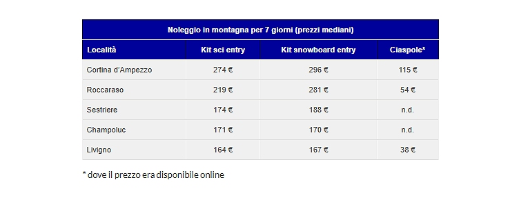 Per il kit sci entry level (composto da sci, scarponi e casco), il prezzo mediano è di 24 euro per una giornata, 53 euro per tre giorni e 110 euro per una settimana. Il kit snowboard entry level parte anch’esso da 24 euro per un giorno, sale a 59 euro per tre giorni e a 123 euro per sette giorni. Le ciaspole costano 7 euro per un giorno, 18 euro per tre giorni e 38 euro per una settimana.