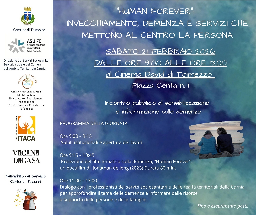 In Carnia la popolazione anziana è il triplo di quella giovane, a Tolmezzo un incontro pubblico per costruire una comunità competente e inclusiva di fronte alla sfida delle demenze. Promuovere una cultura della cura consapevole, per sostenere la quotidianità delle persone con demenza o Alzheimer, ma anche delle loro famiglie e caregiver. Sabato 21 febbraio dalle 9 alle 13 al Cinema David di Tolmezzo “Human Forever”, una mattinata dedicata alla scoperta dei servizi e delle risorse disponibili in Carnia a favore delle persone con deterioramento cognitivo e delle loro famiglie. Ingresso gratuito fino ad esaurimento dei posti.