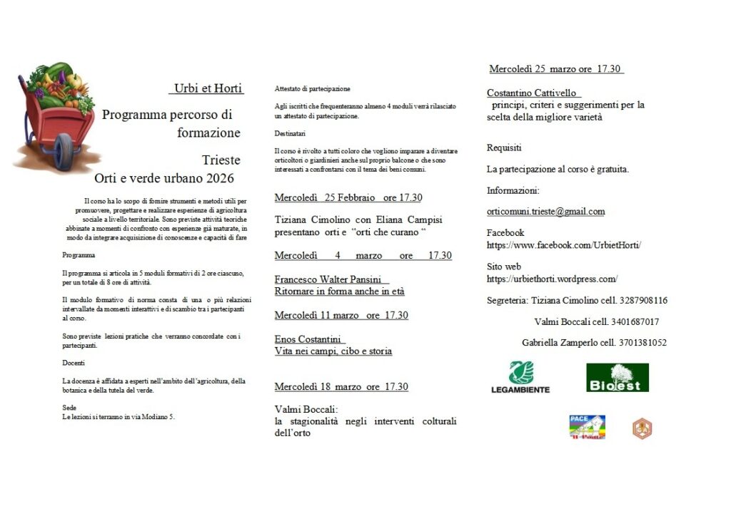 Forte del successo delle passate edizioni e a grande richiesta, prenderà il via mercoledì 25 febbraio un nuovo corso-percorso di formazione dedicato all’orticoltura e al verde urbano promosso dall’associazione Bioest e Orti Comuni Trieste con il patrocinio del Comune di Trieste e in collaborazione con Legambiente,  Associazione “Il Ponte”  e  Consorzio Apicoltori della Provincia di Trieste.