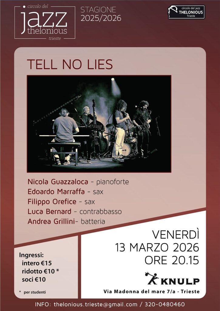 Venerdì 13 marzo alle ore 20.15 presso il Knulp in vioa della Madonna del mare 7/a a Trieste, il Circolo del Jazz Thelonious presenta TELL NO LIES (Nicola Guazzaloca – pianoforte / Edoardo Marraffa – sax / Filippo Orefice -sax / Luca Bernard – contrabbasso / Andrea Grillini – batteria)