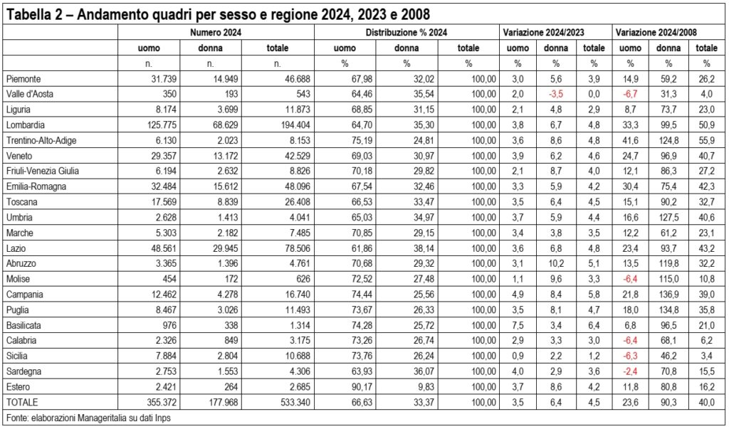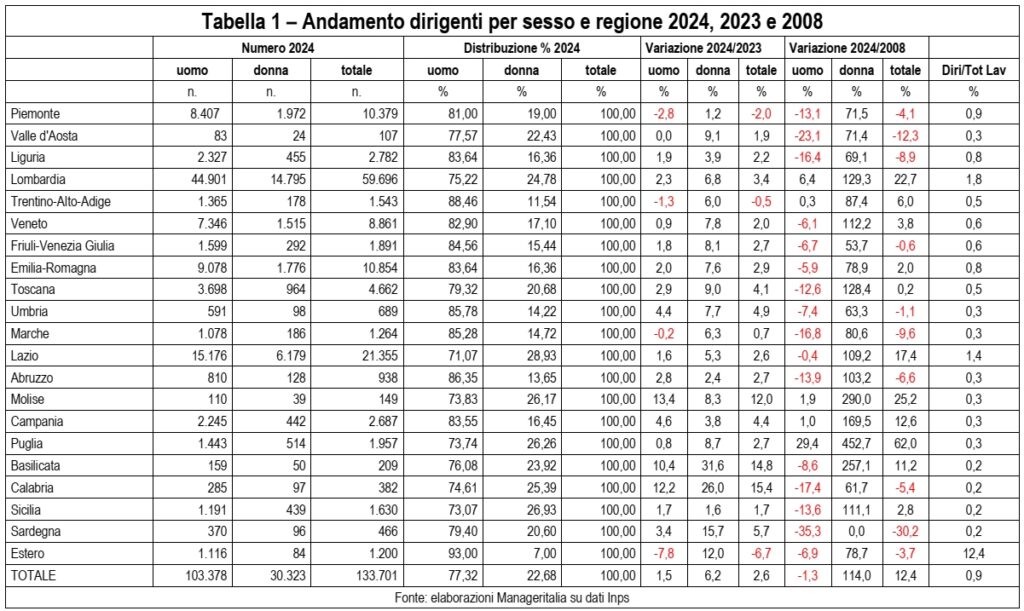 I dirigenti crescono in maniera diffusa sul territorio nazionale con le sole eccezioni di Piemonte (-2%) e Trentino-Alto Adige (-0,5%). Le crescite più marcate si registrano in Calabria (+15,4%), Basilicata (+14,8%), anche se con bassi numeri assoluti. Ottimi tassi di crescita anche in Sardegna (+5,7% ma -30,2% dal 2008) Umbria (+4,9%) e Toscana (+4,1%) e si confermano Lombardia (+3,4%) Lazio (+2,6) ed Emilia-Romagna (+2,9%) che in assoluto sono nell’ordine le prime tre regioni per dirigenti.