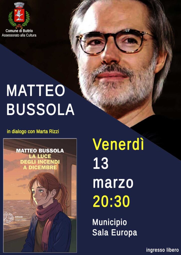 Venerdì 13 marzo alle ore 20:30 in Municipio – Sala Europa – a Buttrio Matteo Bussola, ospite dell’Assessorato alla Cultura, presenta il suo ultimo romanzo “La luce degli incendi a dicembre”